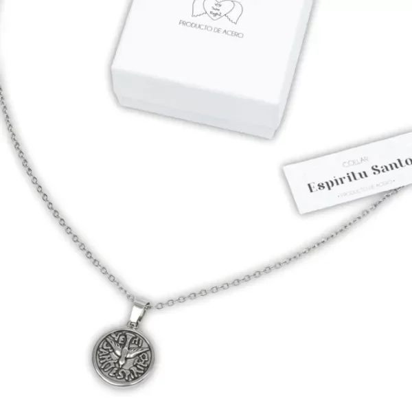 Collar de cadena fina con un dije de acero del Espíritu Santo. ¡Es súper delicado! Y lo mejor de todo es que es fácil de combinar con cualquier outfit, así lo podés usar todos los días sin problema.