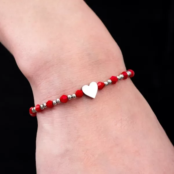Pulsera de acero con cristales facetados bordó que aportan un toque vibrante y cuentas de acero que realzan su sofisticación. En el centro, un dije en forma de corazón 💖, también de acero, simbolizando el amor. Viene en una lata reutilizable, perfecta para regalar o mantener tus accesorios organizados. 🎁