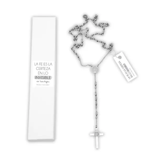 Rosario largo de acero con cuentas medianas todo de acero con centro y cruz de San Benito. Una opción clásica y unisex.