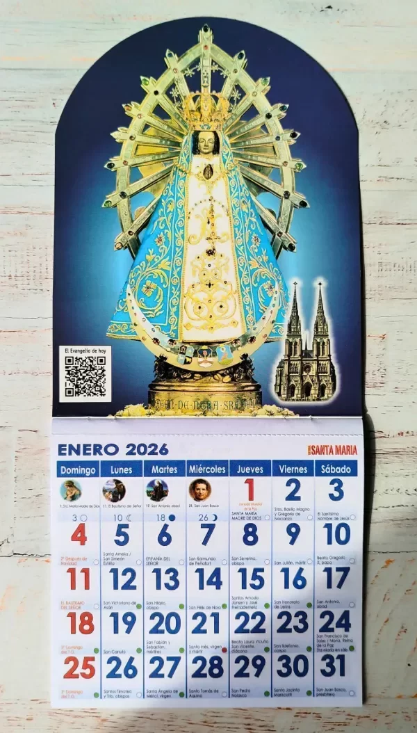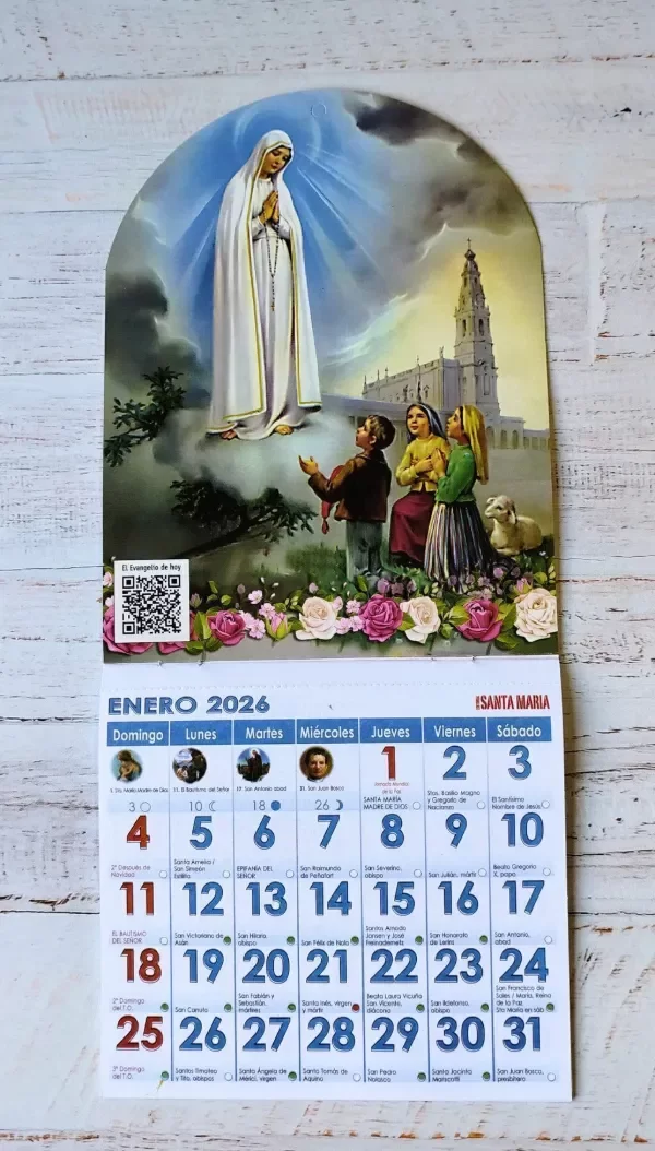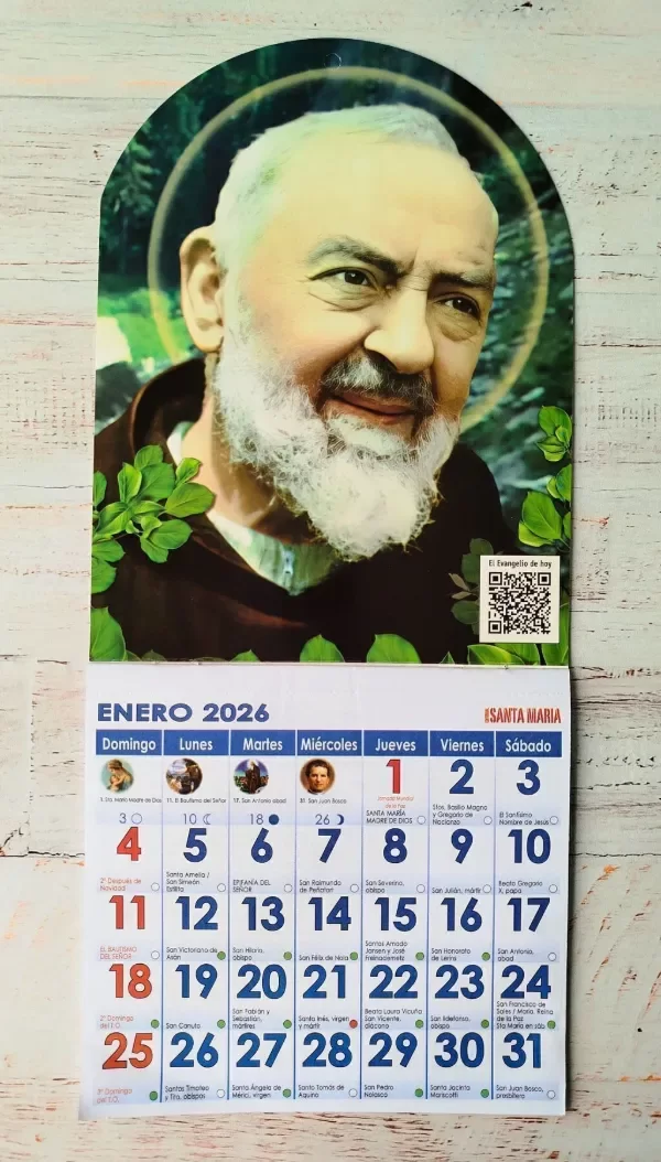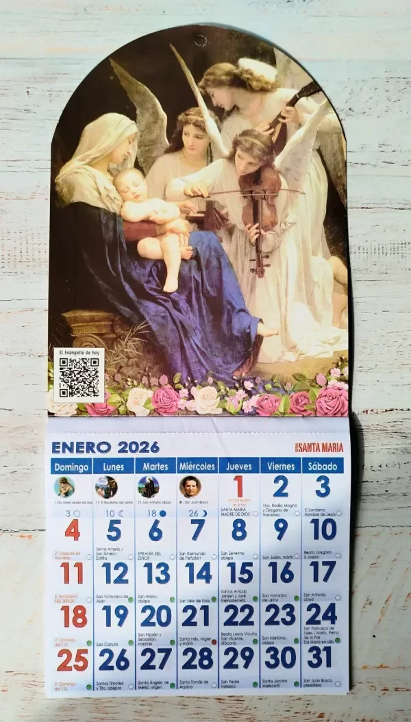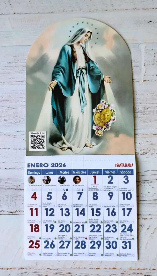 Almanaque capilla 2026 con imagen. Incluye oración en la parte laminada de abajo que se puede recortar, además de santoral para todo el año, colores litúrgicos para cada día, además en la parte de atrás de cada hoja están todas las lecturas de cada día de todo el mes. Posee también, un código QR para obtener el evangelio de cada día.