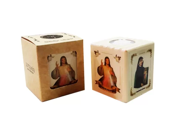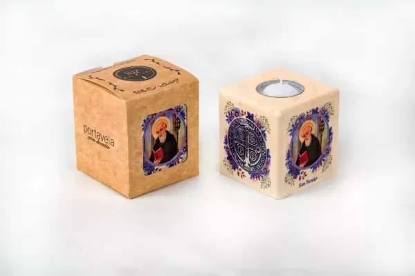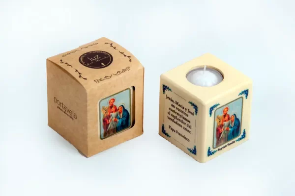 Portavela de madera con imagenes. Medidas: 7,5 ctms (alto) x 6,7 x 6,7 ctms. Incluye vela de noche y cajita de cartón.