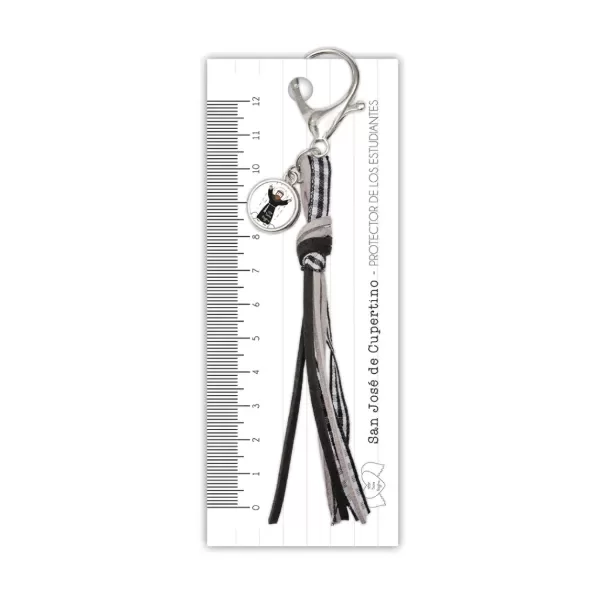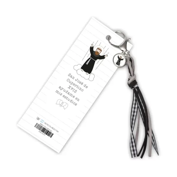 Bendición para colgar en la mochila o cartuchera con dije de San José de Cupertino. Incluye una tarjeta que tiene un lado con regla de 12 cm y del otro la oración “San José de Cupertino xfis ayudame en mis estudios”.