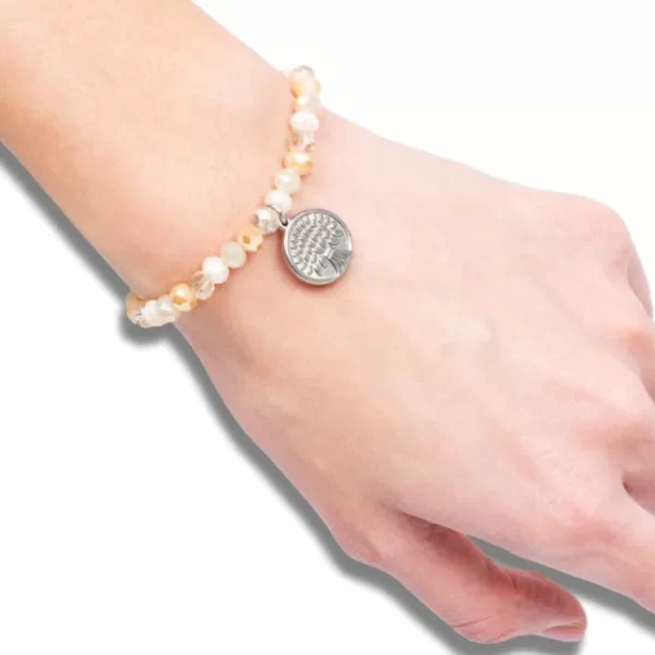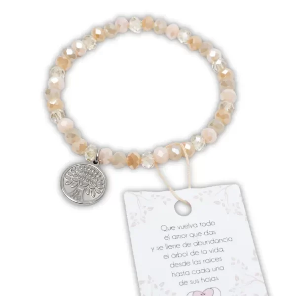 Pulsera elastizada de cristales en tonos nude con dije de acero quirúrgico del Árbol de la Vida. El Árbol de la vida representa la esencia de nuestra existencia y transmite fuerza y positividad. Tiene muchos significados: de manera general, el Árbol de la vida representa el ciclo de la vida: el nacimiento, representado por sus profundas raíces. Nuestra vida, representado por el tronco que va creciendo en dirección al cielo. Las ramas, con sus innumerables bifurcaciones, representan los cruces de camino que nos vamos encontrando por la vida y que nos obligan constantemente a tomar decisiones.