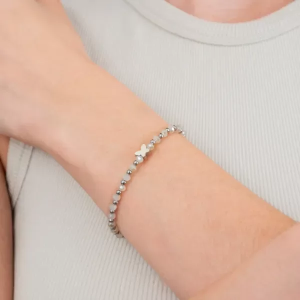 Pulsera de cristales nude con aurora boreal muy delicados y acero quirúrgico. Tiene un dije pequeño de una mariposa, también en acero. ¡Es un regalito divino🎁!