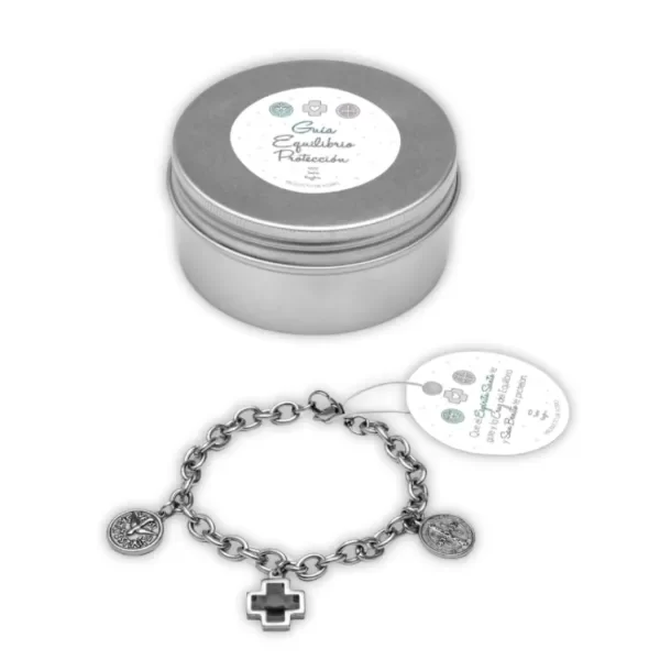 Pulsera de cadena con dijes, todo en acero quirúrgico. Tiene dijes del Espíritu Santo para que te guíe, una cruz del Equilibrio y una medalla de San Benito que te protege. Es una opción hermosa para regalar o auto regalarse, ideal para usar todos los días.