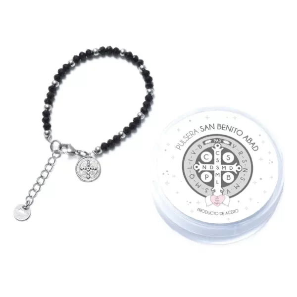 Adentrate en la esencia de la protección con nuestra pulsera de cuentas de acero y cristal, acompañada de un dije de acero con la imagen de San Benito en un lado y la cruz en el otro.