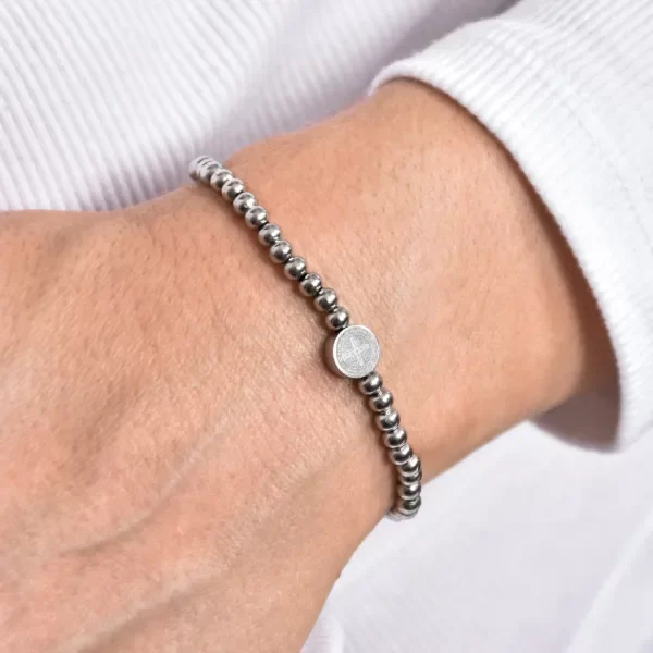 Pulsera elastizada con cuentas de acero y un delicado dije pasante de San Benito, símbolo de protección y fe 🙏✨. Diseñada para ser versátil y fácil de combinar, es ideal para acompañarte en tu día a día. Viene presentada en una lata reutilizable con un sticker exclusivo, pensada para convertir cada regalo en un momento único 🎁. ¡Sorprendé a alguien querido y regalale la protección de San Benito!