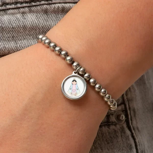 Pulsera elastizada con cuentas de acero quirúrgico y medallas de la Virgen Niña, Medalla Milagrosa o Virgen de la Sonrisa con diseño Xfis✨. Una forma tierna y original de sentirse protegido y acompañado. Viene en lata reutilizable con sticker especialmente diseñado para cada modelo.