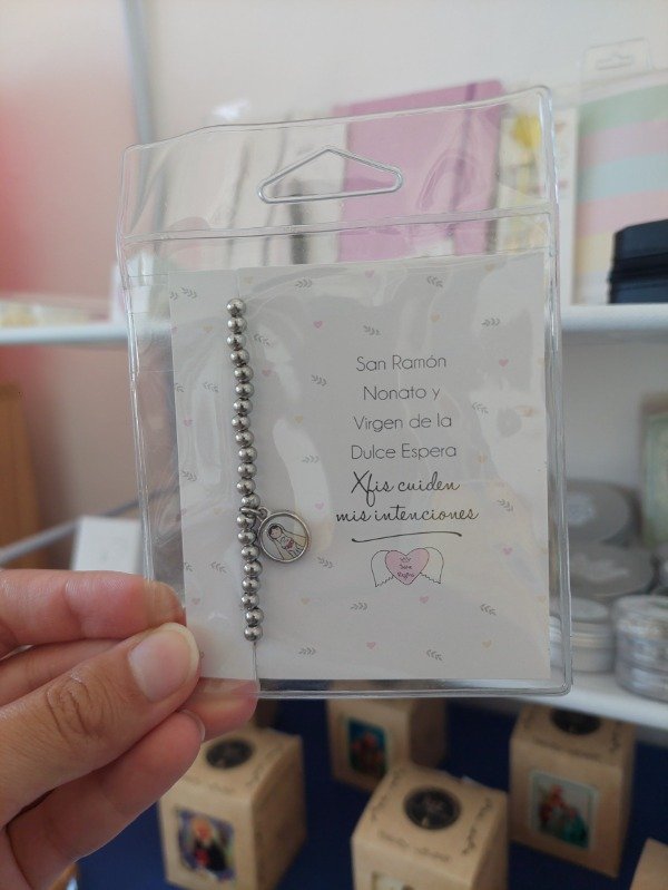 Llená tus días de protección y esperanza con esta pulsera elastizada, compuesta por bolitas de acero de alta calidad. 💫 Incluye un dije con la imagen de San Ramón Nonato (patrono de los niños por nacer y a quién se le intenciona poder formar una familia) y la Virgen de la Dulce Espera que representa cuidado y fe para las futuras mamás. 🤰✨ Acompañada de una hermosa tarjeta diseñada especialmente para que cada persona escriba sus intenciones💖.