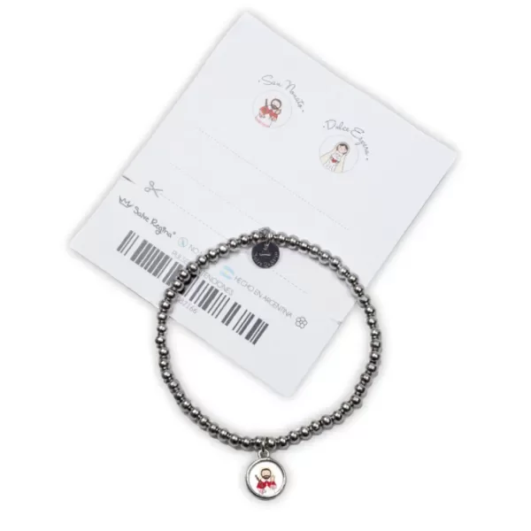 Las cuentas de la pulsera son de acero quirúrgico y la medalla es de aleación de metales.