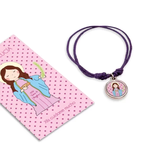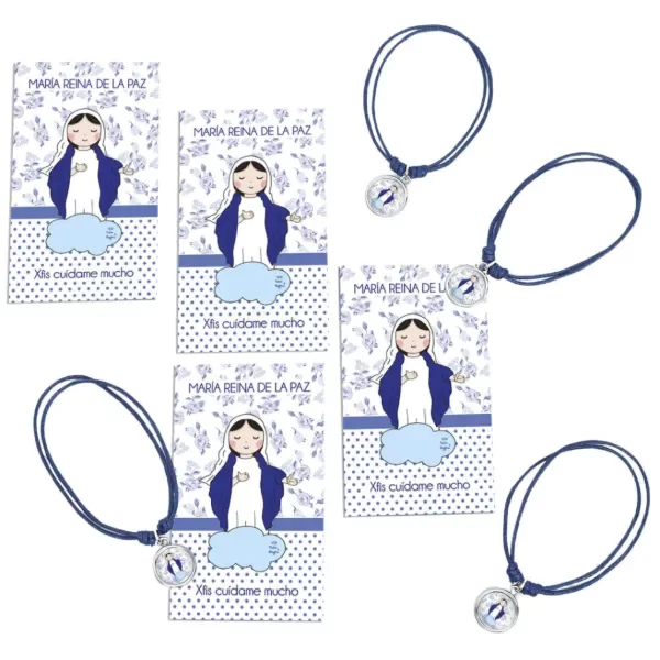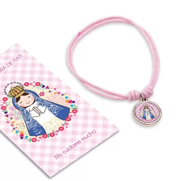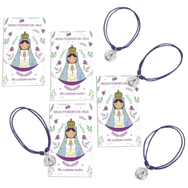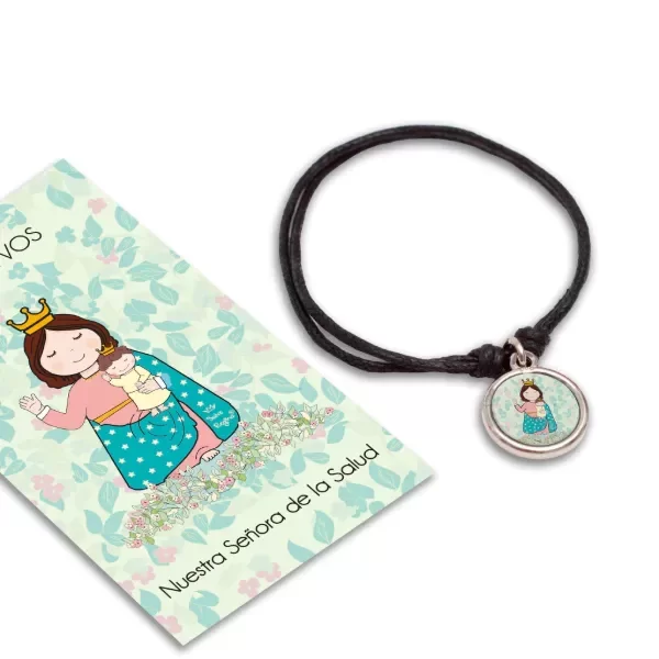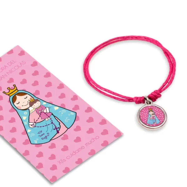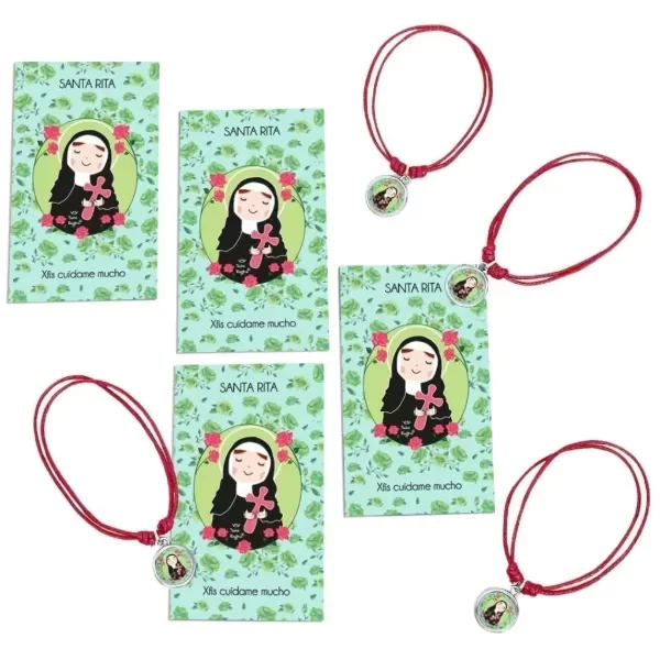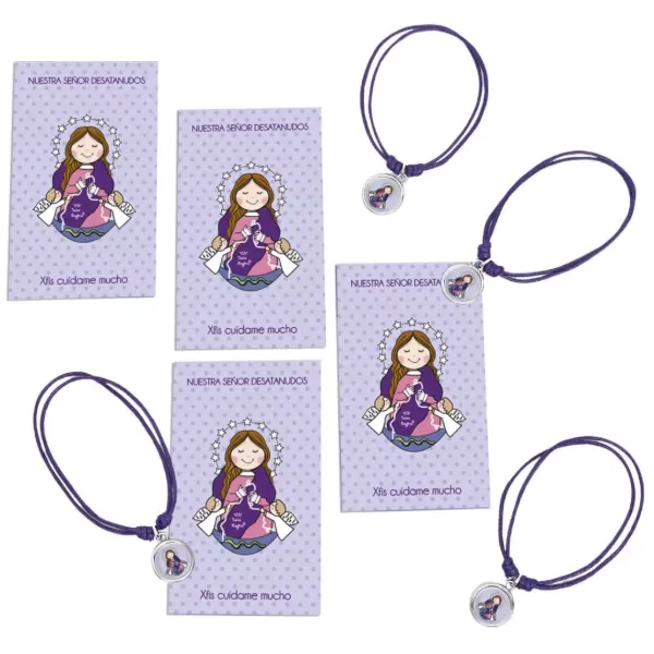 Pulsera de hilo regulable (corres los nudos para ajustarla). Podes usarla como tobillera, pulsera, etc. Incluye la estampita con la oración del santito o virgencita que elegiste.