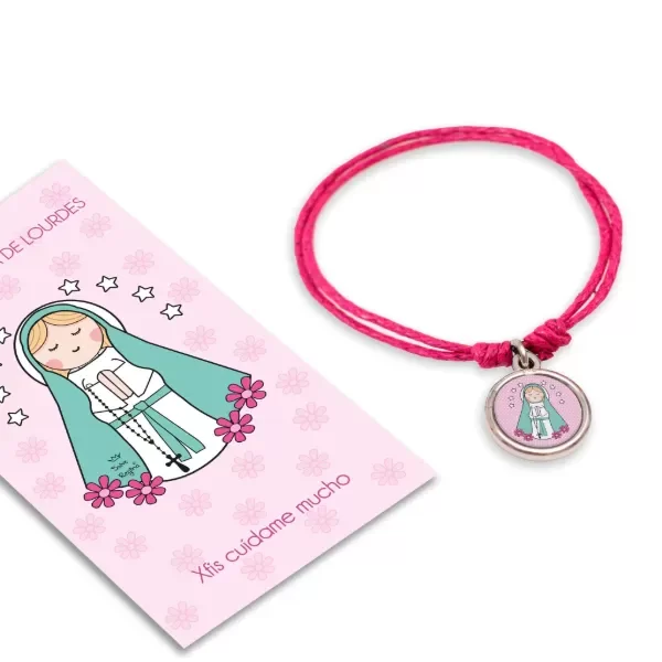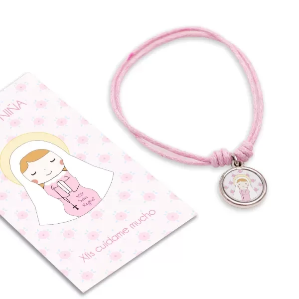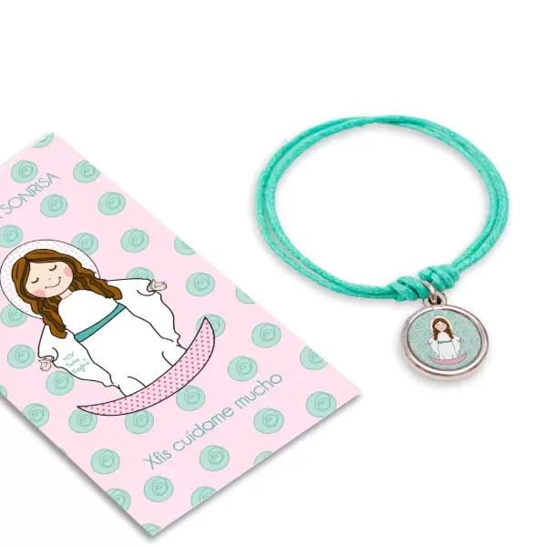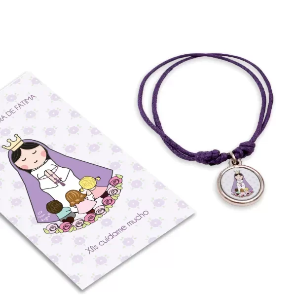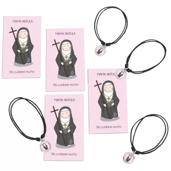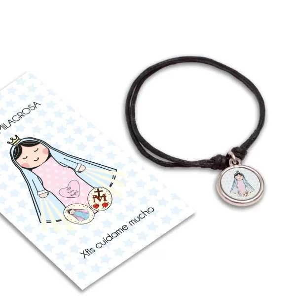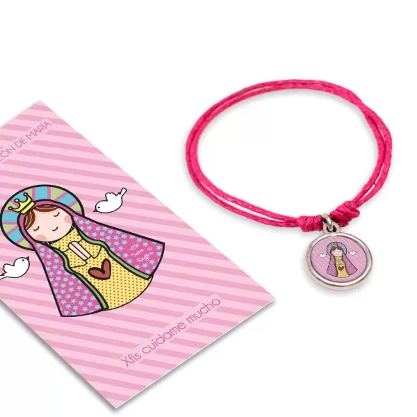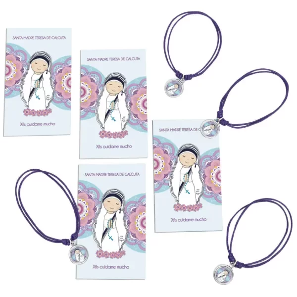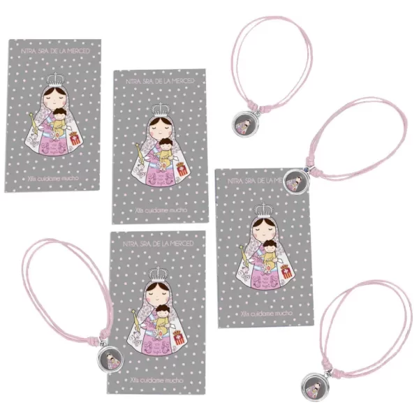 Pulsera de hilo regulable (corres los nudos para ajustarla). Podes usarla como tobillera, pulsera, etc. Incluye la estampita con la oración del santito o virgencita que elegiste.