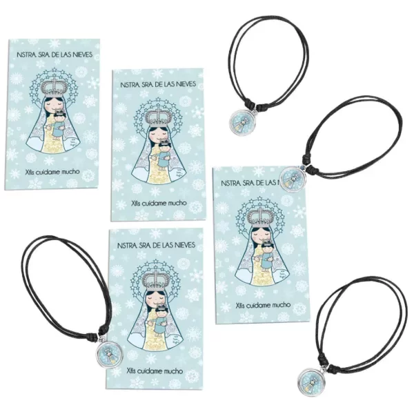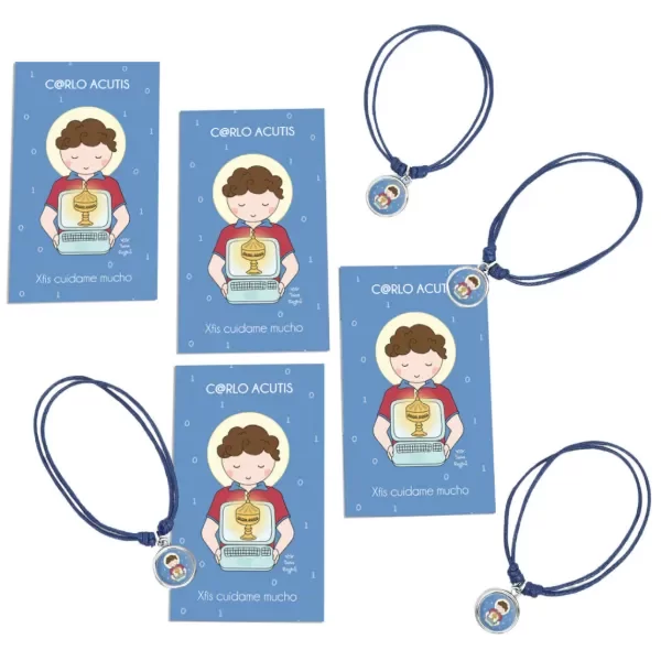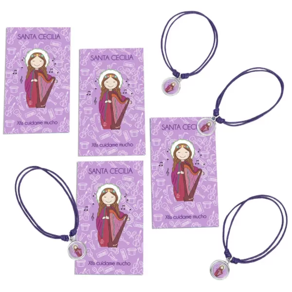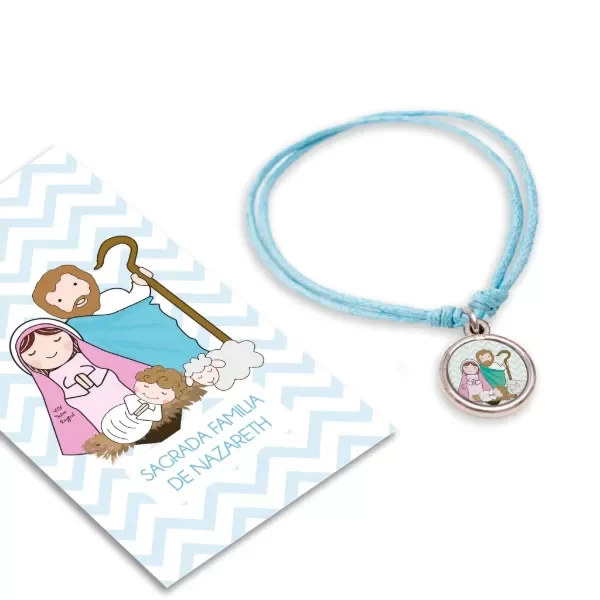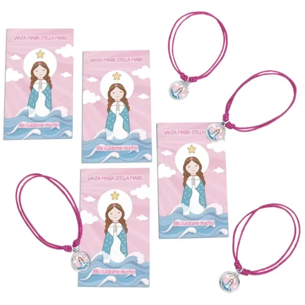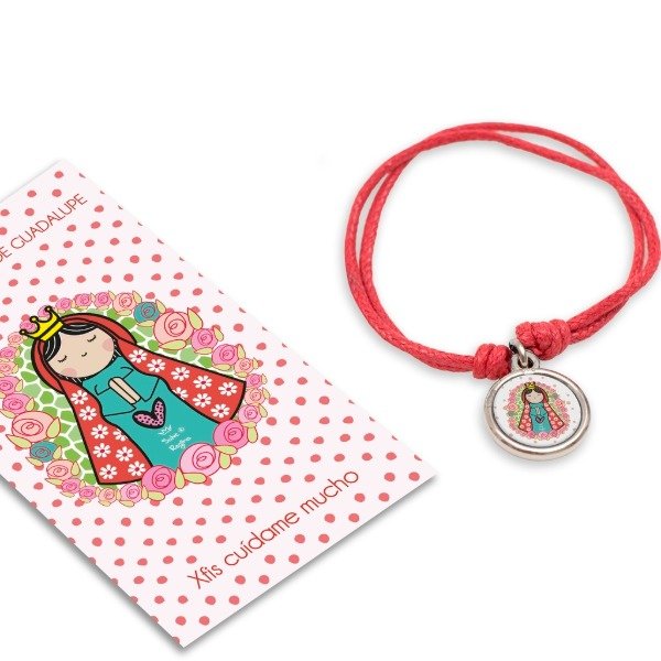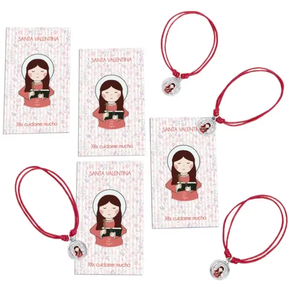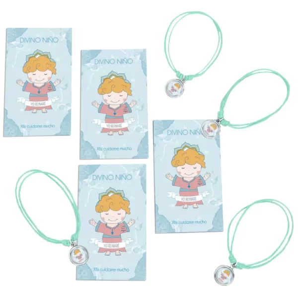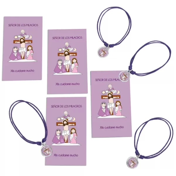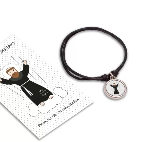 Pulsera de hilo regulable (corres los nudos para ajustarla). Podes usarla como tobillera, pulsera, etc. Incluye la estampita con la oración del santito o virgencita que elegiste.