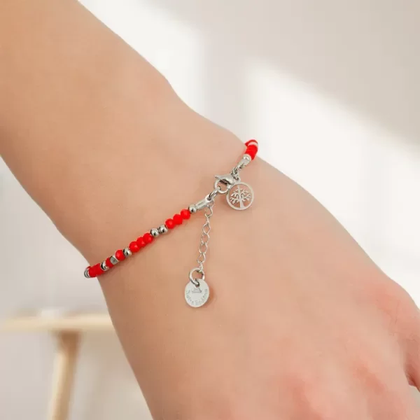 Esta pulsera es perfecta para acompañar y resaltár tus looks de todos los días. Está hecha con una combinación de bolitas y separadores de acero quirúrgico, con unos mini cristales rojos que le dan ese brillo único. Y el toque especial es el dije del árbol de la vida que cuelga de ella, ¡con todo su significado!