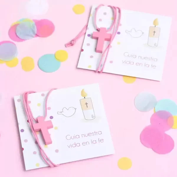 Colgante de cordón con cruz de madera rústica. Ideal para regalar como souvenir de Confirmación, Bautismo o Comunión. Incluye colgante con cruz + tarjeta con frase "Guía nuestra vida en la fe" + bolsita.