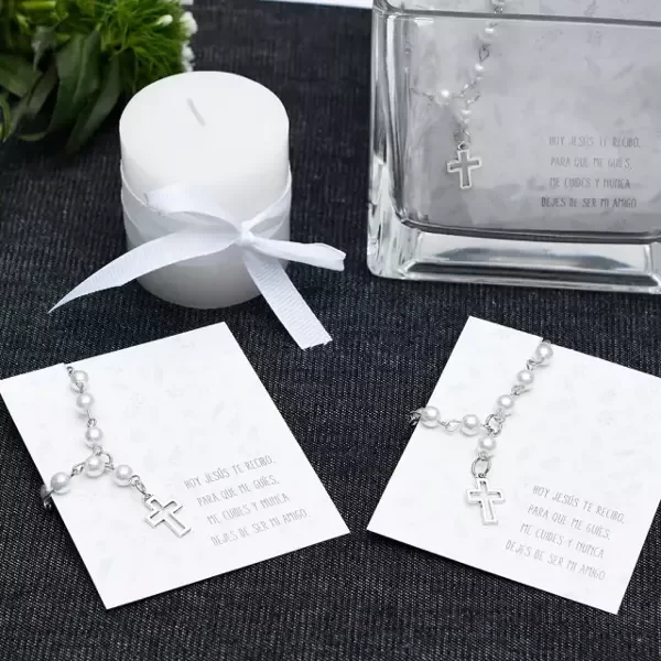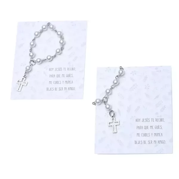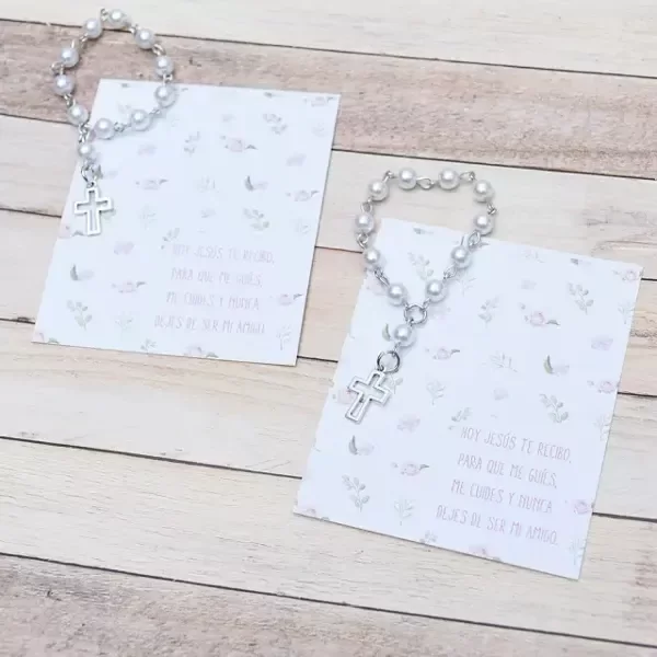 Decenario de cuentas de perlas con cruz calada. Es una opción súper fina y delicada, ideal para regalar como souvenir de Bautismo o Comunión. 👉Incluye estampa con frase y bolsita para presentar.